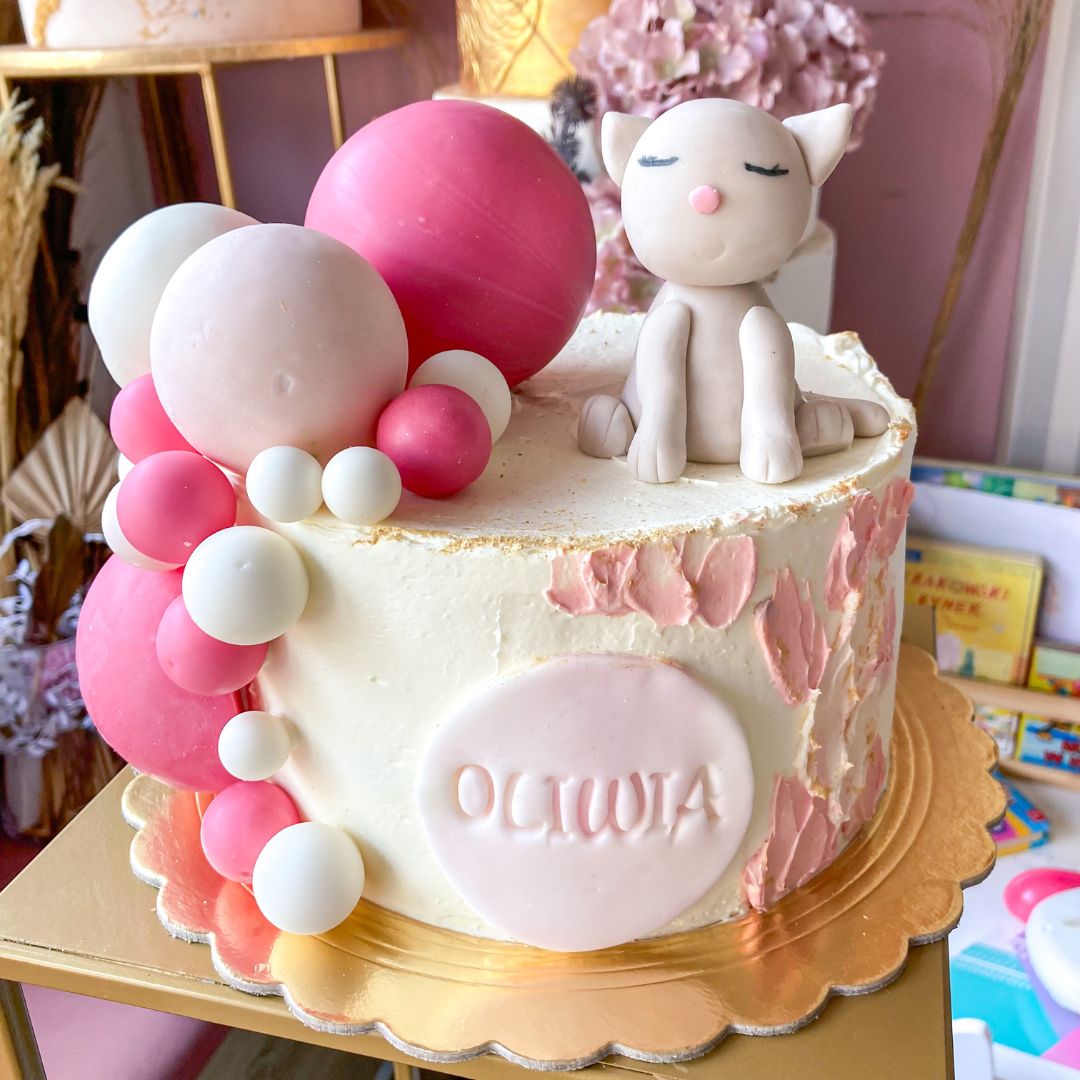 Uroczy torcik z figurką kotka, ozdobnymi balonikami (uwaga, balony nie są jadalne!).