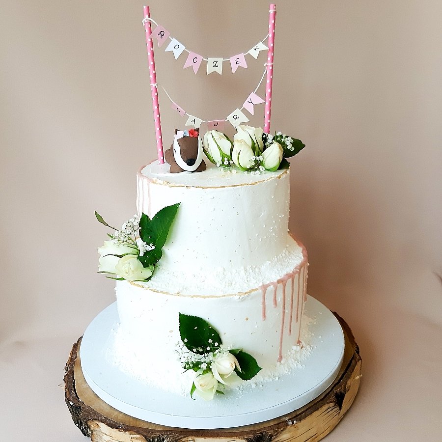 Wyższy tort w kremie na bazie białej czekolady i masła z kompozycją kwiatową, sarenką oraz dowolnym napisem na chorągiewkach.